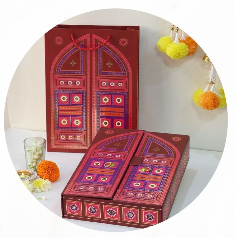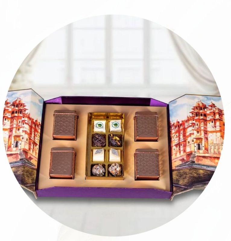 Adorned with the majestic façade of a Rajasthani haveli, this hamper unfolds like a royal doorway 4 revealing a world of exquisite treats within. Framed in regal purples and antique gold, each detail whispers of palatial opulence and cultural richness.