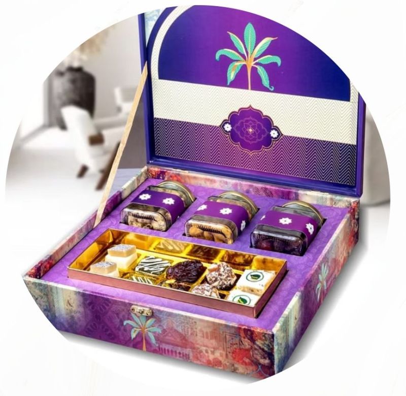 | Contents | Premium Jars,3,Dry Fruits Or Date-based Bites,Regal Purple Sleeve With Floral Motifs,Golden Assorted Tray,3,Milky And Nutty Date Pastries,White Chocolate Drizzled Treats,Dry-fruit Clusters,Fruit-infused Fudge Pieces |