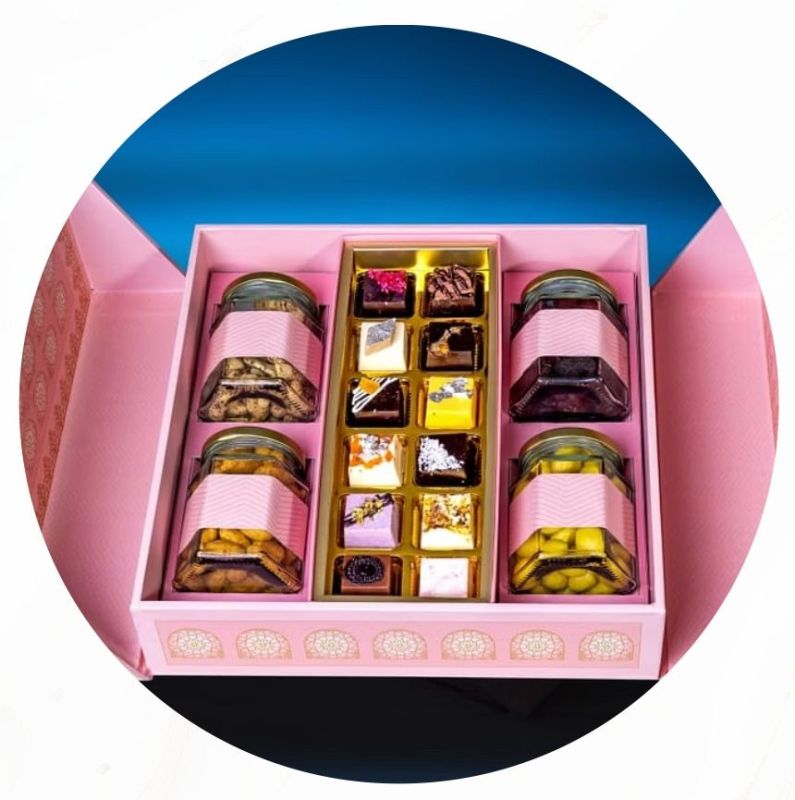 | Contents | Dry Fruits, Berries, Chocolates,4 Signature Jars,Pink Zigzag Wraps,French Indian Fusion Sweets,Creamy Katli,Lemoni Pisti,Raspberry Amande Mélange,Nutties Overloaded,Coconut Meringue |