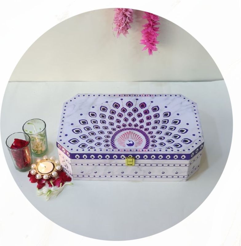 Elegantly wrapped in deep purples and intricate Mughal-inspired patterns, this gift box exudes class and culture. Inside, it features :